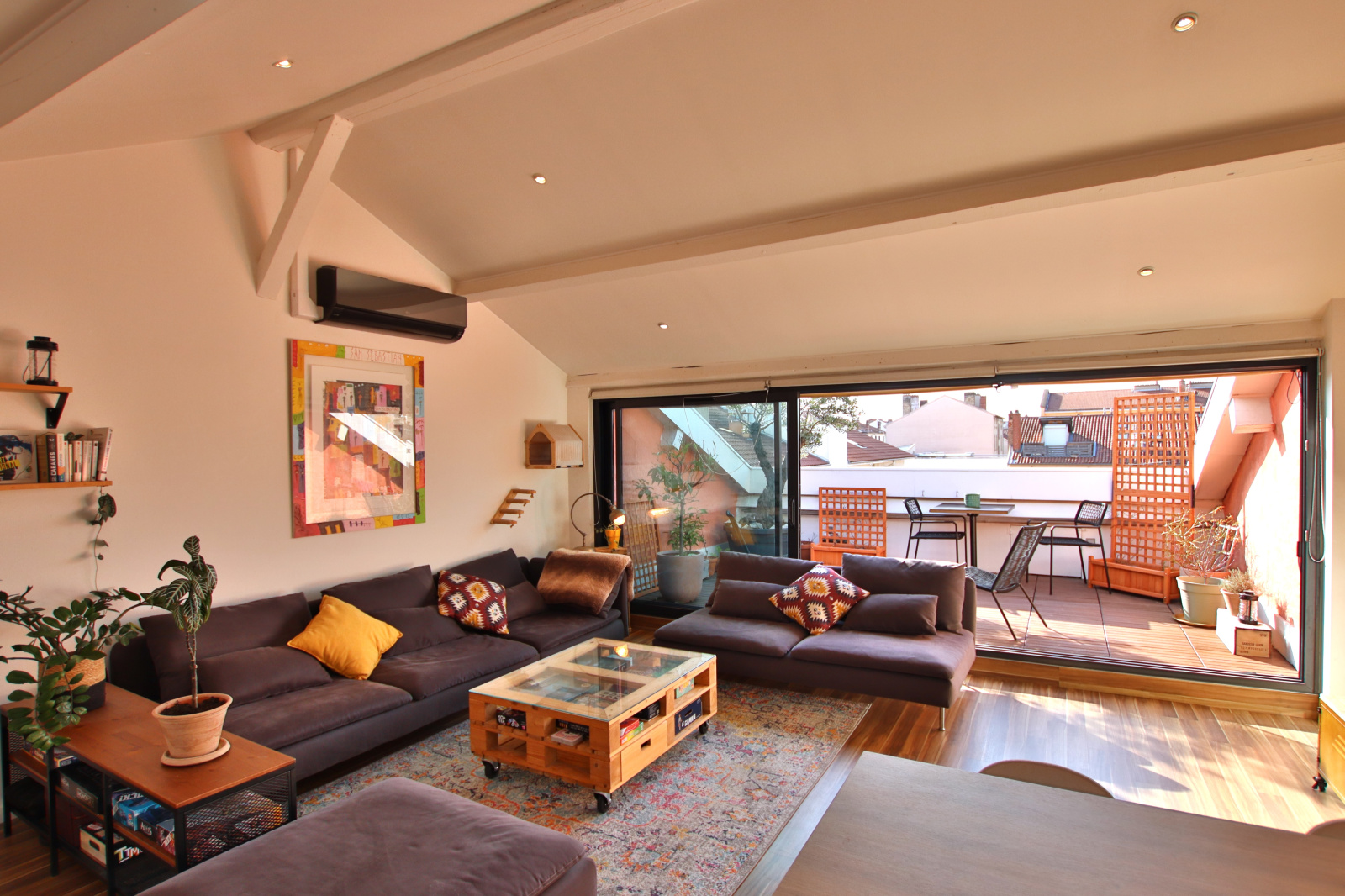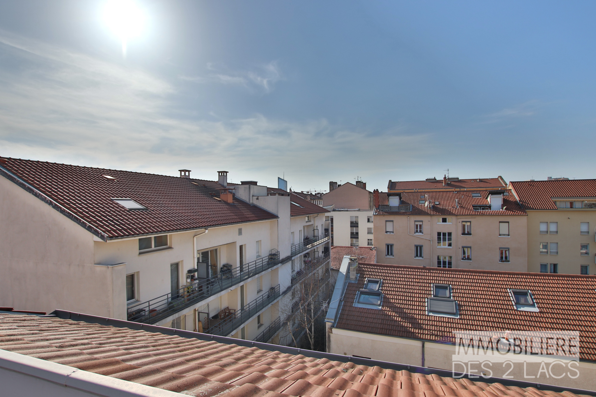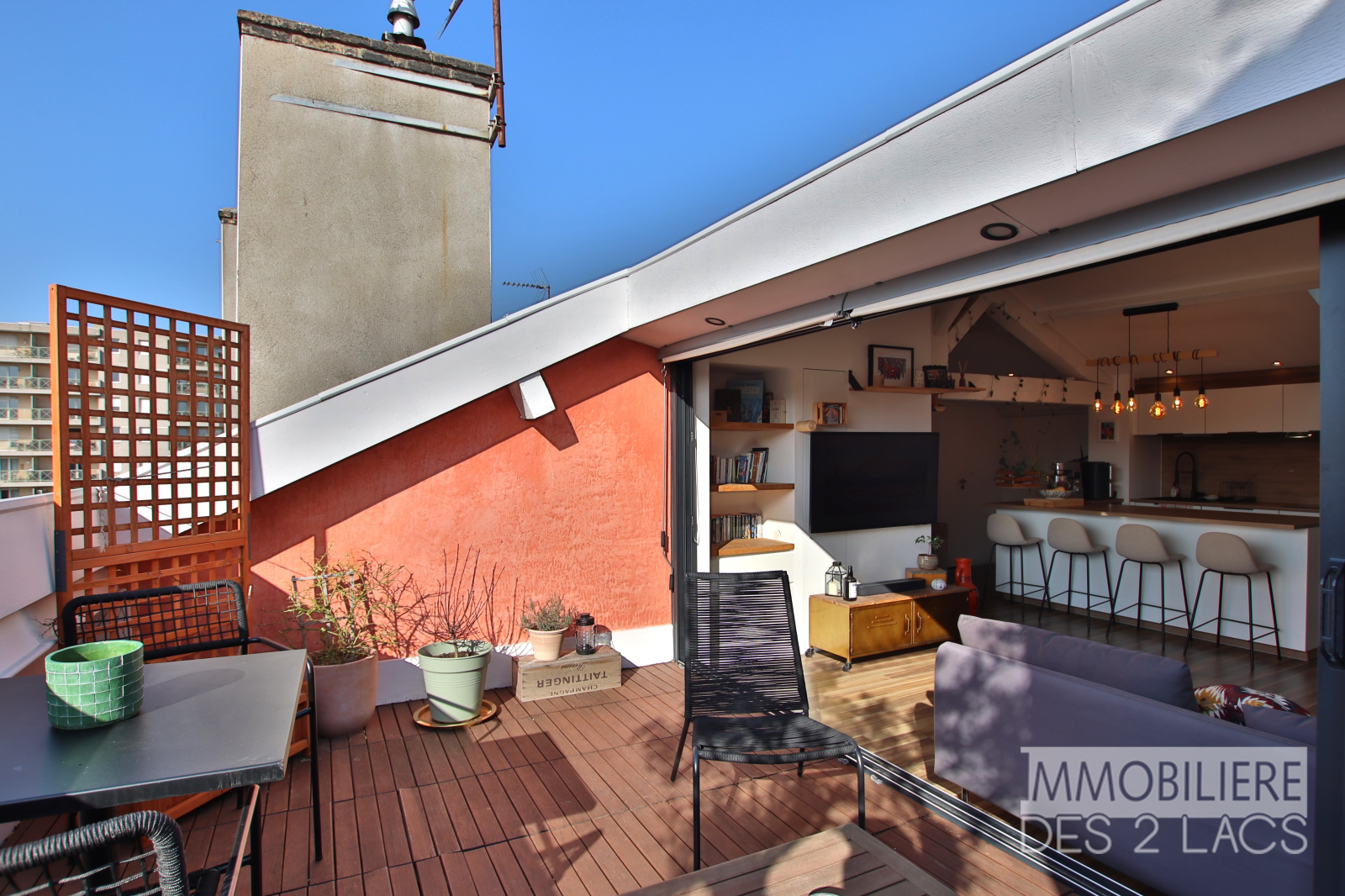 La terrasse tropézienne de 14 m², véritable prolongement de la pièce de vie, offre un cadre rare et privilégié pour profiter des couchers de soleil et d’une vue dégagée sur les toits de la ville, avec en perspective les emblématiques tours de la Part-Dieu.