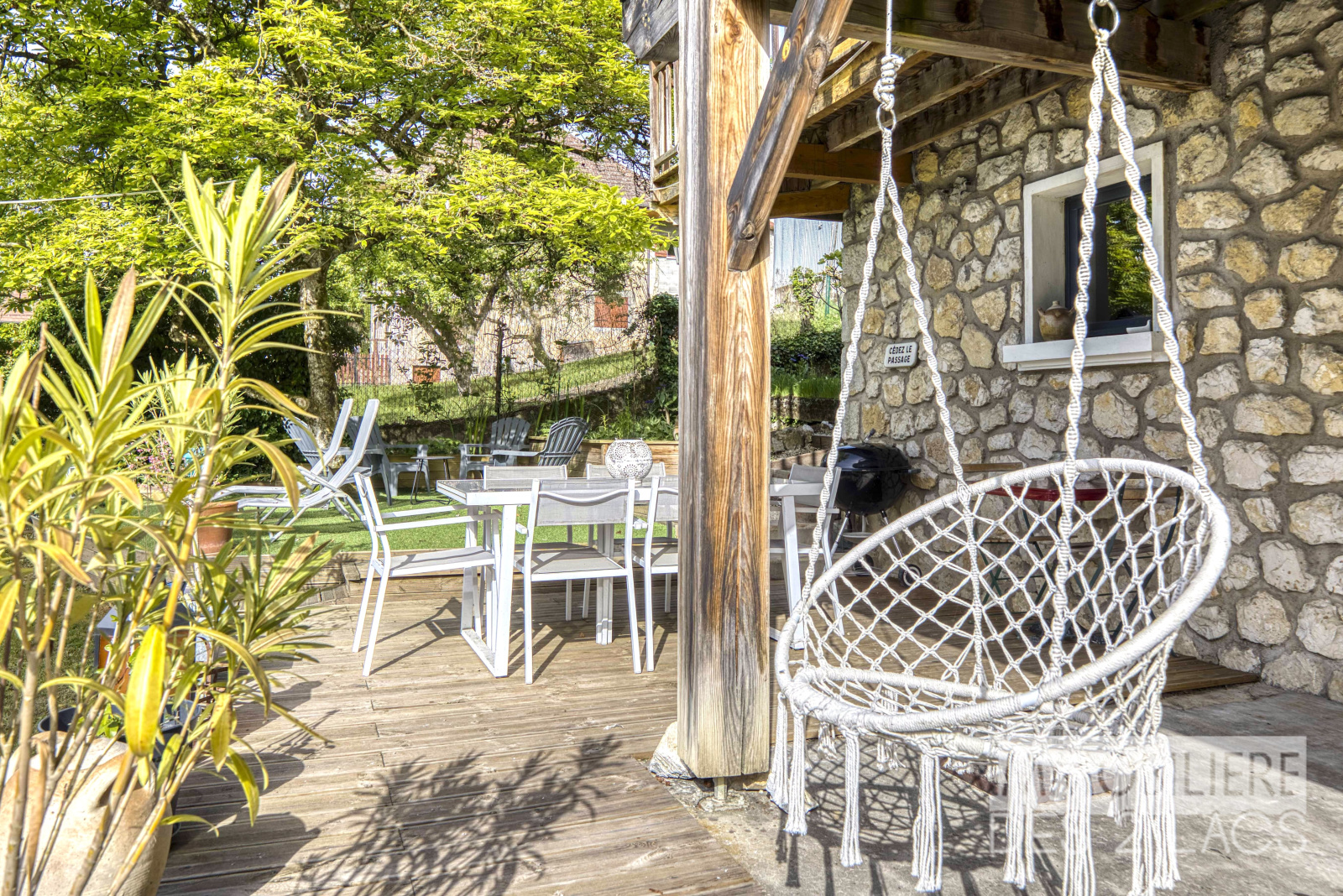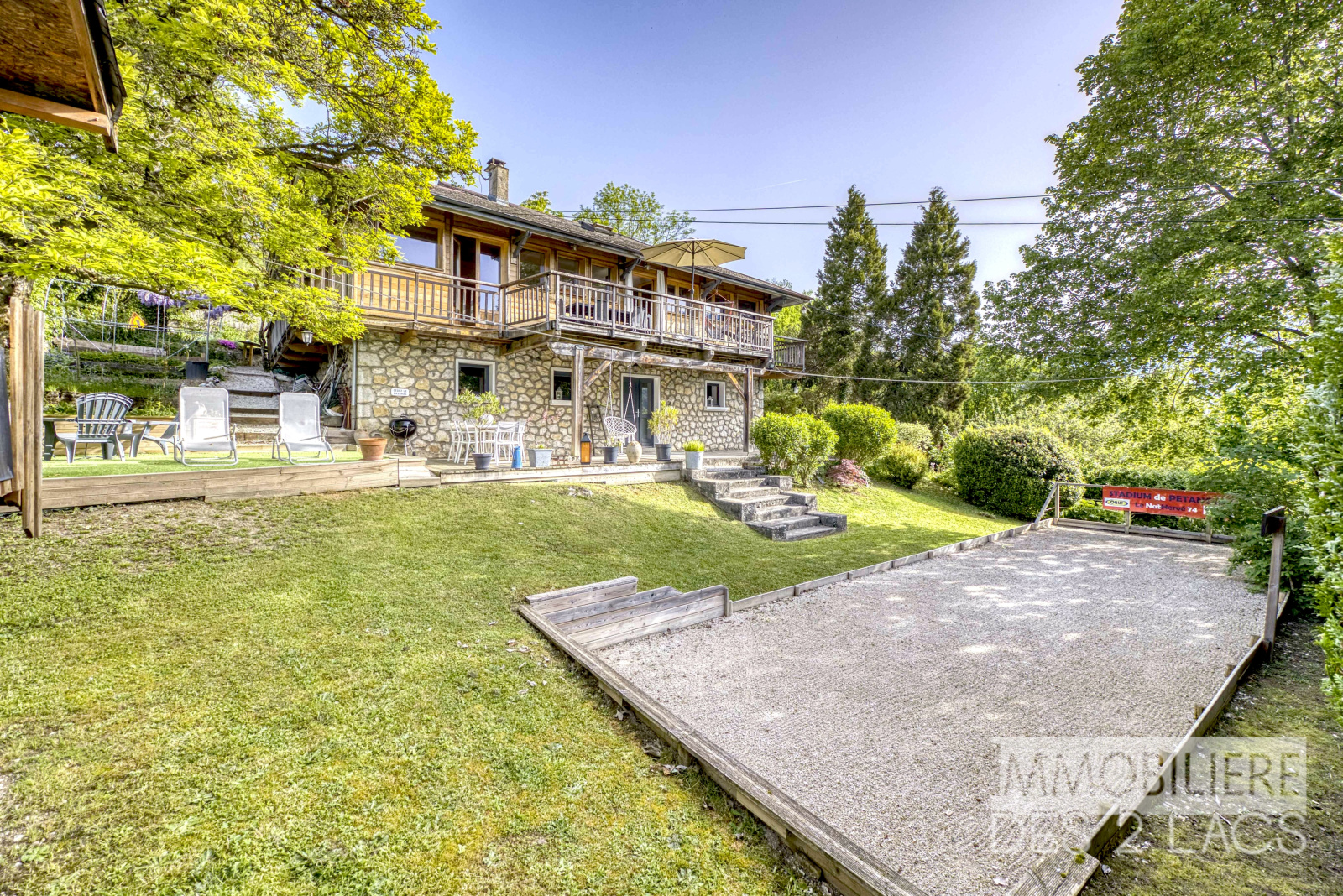 La maison offre de multiples espaces extérieurs pensés pour la détente et les moments en famille : terrasse ensoleillée, jardins arborés, terrasse à l’arrière et même un terrain de pétanque pour des instants conviviaux.