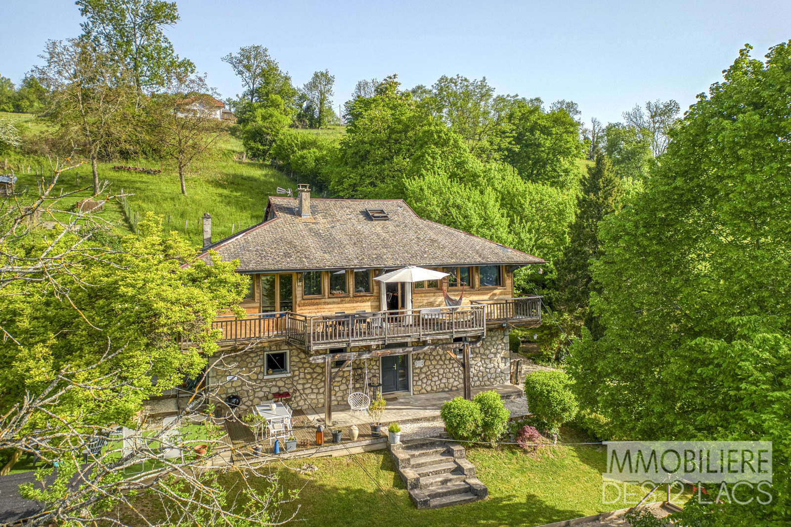 En hauteur sur un terrain paysager de 1039 m², Le Chalet de 159m2 environ surplombe la campagne environnante et bénéficie d’une vue dégagée sur les montagnes du Massif des Bauges. Un véritable havre de paix, à l’abri des regards, où règnent sérénité et douceur de vivre.
