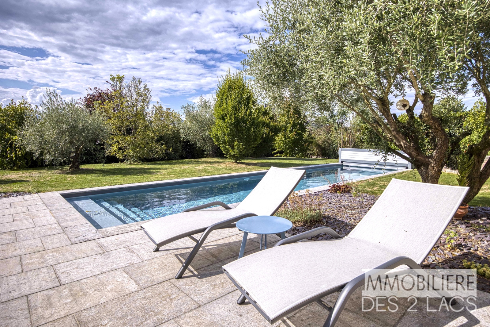 Belle exposition pour ce jardin paysager, soigneusement entretenu, accueillant une piscine couloir de nage chauffée de 12,5 m x 3 m, parfaite pour les amateurs de natation et de détente.
