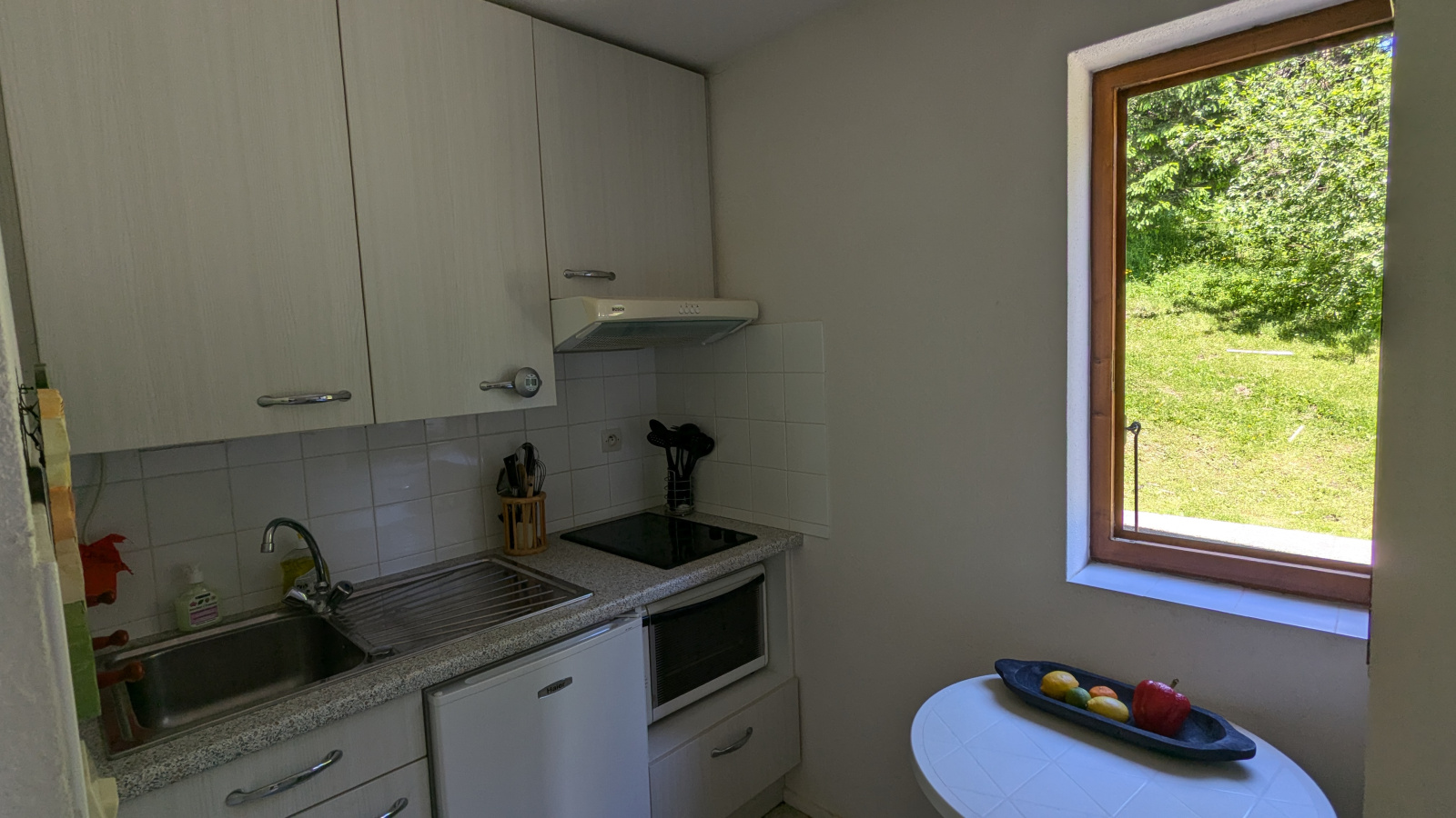 Il dispose d'une cuisine séparée et d'une chambre 2 personnes. On pourrait sans problèmes faire quelques aménagements simples pour gagner au moins deux couchages encore.