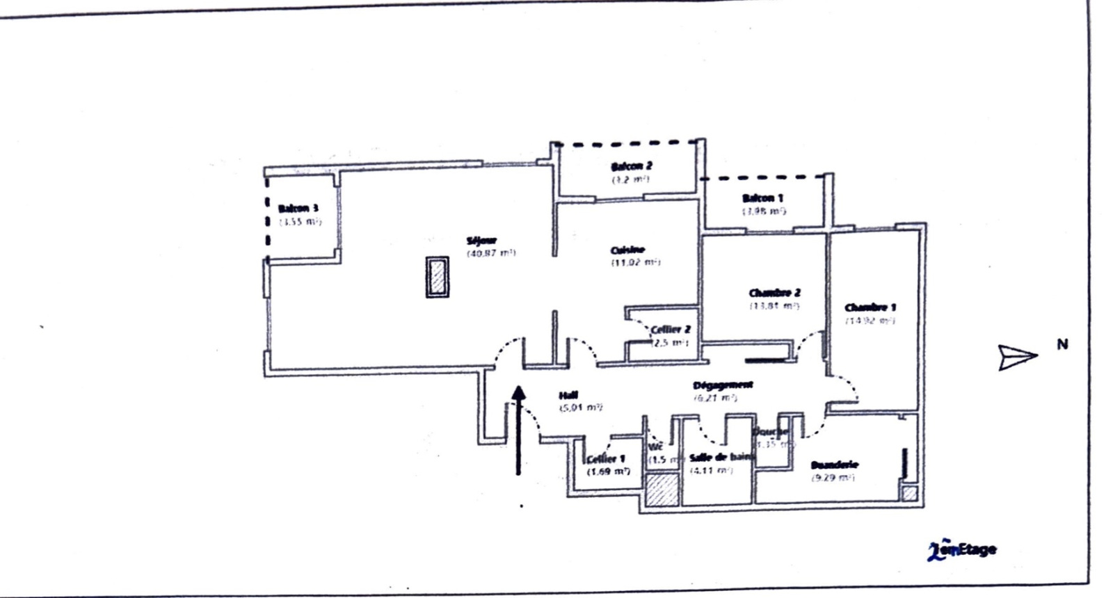 La pièce de vie lumineuse de plus de 61m2 se compose d'un double séjour avec une cuisine à aménager ouverte sur deux vastes balcons.